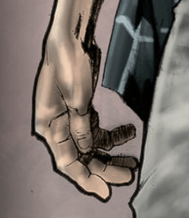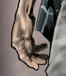 There’s not too much new to say here: the art style is very similar to that of the first one: Yvel Guichet makes a comeback to illustrate this one, as well. There’s some interesting inconsistencies, or artistic contrivances, that I noticed this time around. If you take a look to the image on the left, you’ll see that the linework for this hand is a little rough, and the shadow isn’t completely blacked out: in fact, it looks a little like pencil. In some places, though, even on the page that I extracted that image from, you see much cleaner lines that look like pen. I’m not sure if this is intentional or if it’s simply the result of having a relatively small art team on this project: either way, it doesn’t detract from the experience (for me).