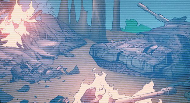 The coloring though, is very well done! Tank battles and various and sundry explosions remain the high point of the comic for me. Yvel Guichet does an excellent job of rendering these sequences, and the colorist Tony Avina has a marvelous touch! To be honest, I do prefer the color work in comic 0 to the color work done in 1 and 2, but the lighting remains superb through all 3 comics thus far. The colors are muted without being boring, and I can’t say enough about the lighting effects. This probably won’t greatly alter your decision to read the comic: most moderrn comics have similar lighting. I just really appreciate Tony’s work here. It really helps to set the mood, whether it’s a battle, exposition or interrogation.