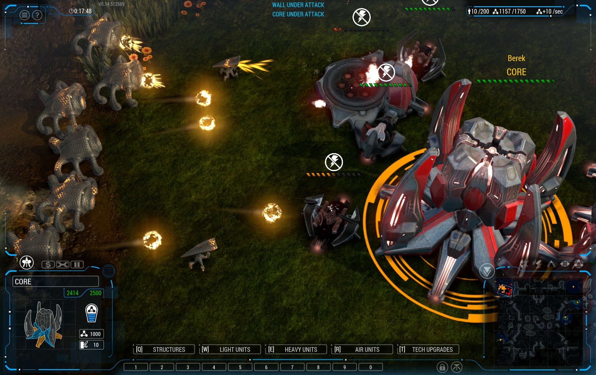 Unit design, particularly in tier 1 units, is noticeably consistent across the 3 factions. The initial 2 units in each faction are different in subtle but important ways (actually that’s true of many of the game’s units) with most of the differentiation coming in terms of range, move speed, damage profile (dps, damage per shot, fixed/turret, fire while moving etc) hit points and armor having often slight variations. This is definitely in keeping with the game’s goal of cutting out clutter, but asymmetrical design is one of the hallmarks of RTS games and is something I definitely appreciate. Now, while the Beta and Human factions have the most similarities between their units, the economics of these factions to produce some meaningful differences. First off, Humans tend to have supply line problems as they cannot locate harvesting facilities nearby resource veins in most cases, so as the number of refineries they have goes up, they get some extensive harvester trains going – think long distance mining in StarCraft 2. Beta and Goo are able to cut this down considerably. Additionally, without teleporters, Humans have some significant force projection issues in the early game and into the midgame. This makes air dominance a big deal for Humans. Likewise, Human units cannot self-repair out of the box, while Goo units auto-heal when not in combat and Beta have repair pads. These small differences (and others) end up dramatically influencing how players interact with the game map and their approaches to combat.