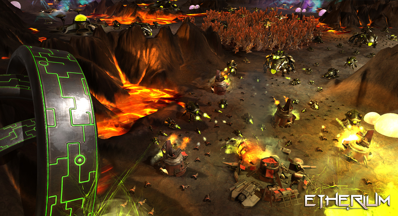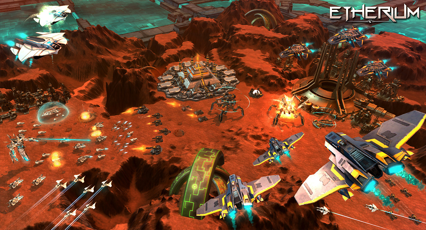 Etherium takes nods from a wide range of RTS games and conventions. The core game has some broad similarities to Company of Heroes, with the map is divided into territories which the player must capture. Some of these territories will contain Etherium veins, which can only be mined by the player in control of that territory. Also similar to the CoH games, territories must be connected to one another in a direct line to the player’s base sector to provide benefit to the player, making it a valid strategy to cut off enemy sectors close to a player’s base, depriving them of the benefits of more than 1 sector at once.