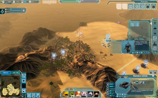 The UI, however (see above) is frustrating at best. It’s scattered, with elements in all 4 corners of the screen, meaning there’s no good location to reference for information. You get used to it, but the UI is quite weak overall, which could easily frustrate RTS novices.