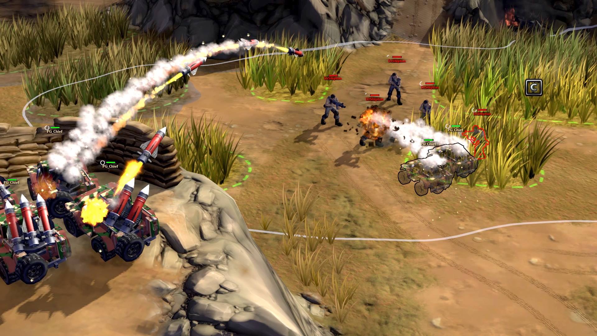 Those who remember End of Nations will be most familiar with Victory Command’s gameplay, I think. The two teams of five spawn, with all of their units initially available, into a relatively large battlefield, strewn with cliffs, brush, structures, infantry-only paths (which also provide infantry a defensive bonus) and a number of objective markers, both primary and secondary.