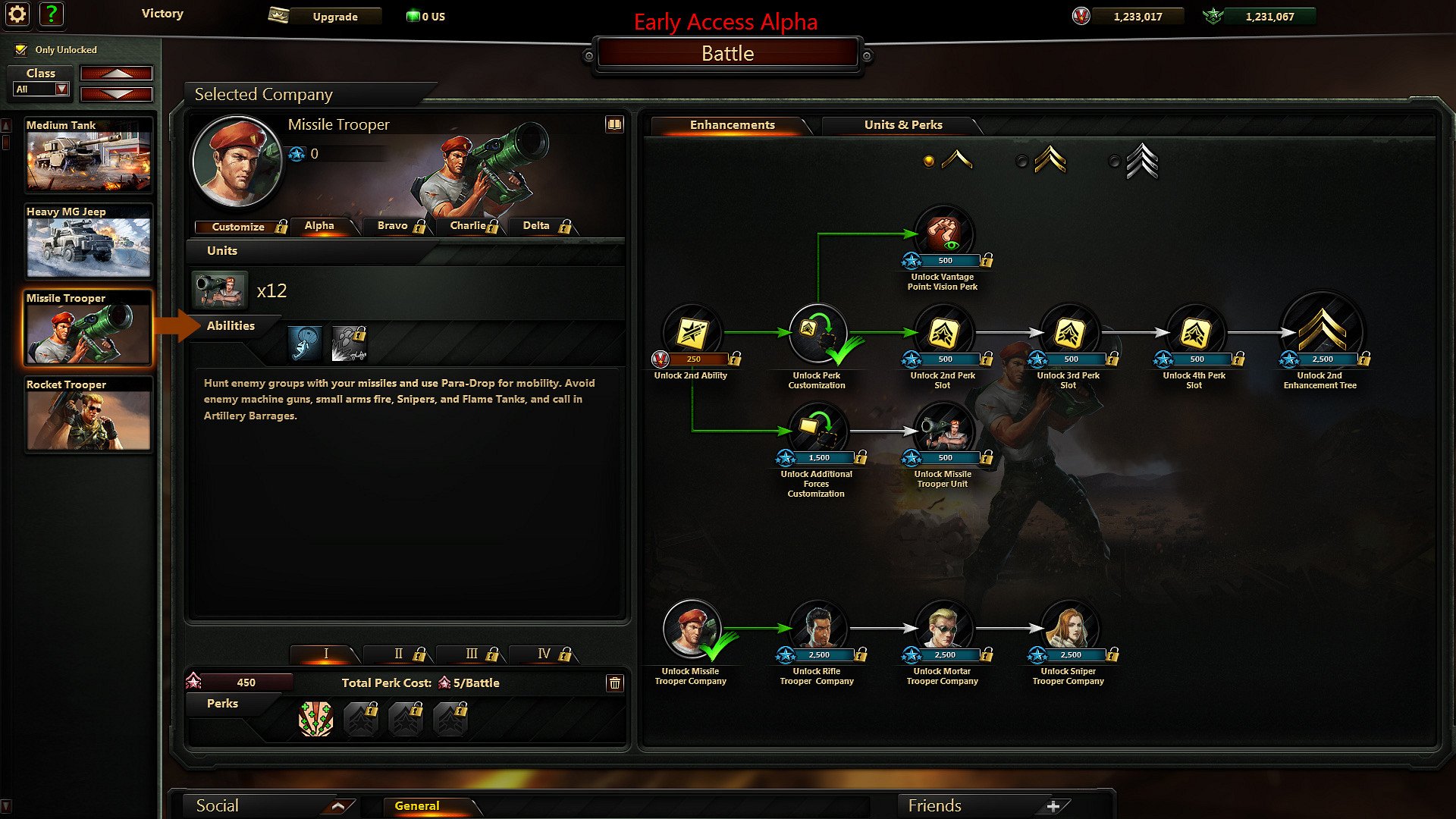 So, the player picks a squad type. These squads are divided into one of 3 general categories: infantry, light vehicles, or tanks. Each squad is a self-contained unit, with all of the perks, units, and global abilities the player will have access to in combat. Furthermore, each squad has its own 3 tiered tech tree. As a player uses a squad, the squad gains experience that can be used to unlock items within that squad’s tech tree. Again, like in Rise of Immortals, the game is designed around the use and upgrading of individual ‘heroes’ or squads in this case, and not with any account wide level, tech tree or specialization.