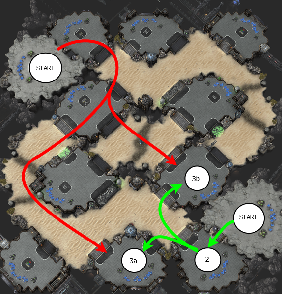 In this map players spawn opposite of each other, for this example the player will start in the bottom right. Within Starcraft 2 a player usually looks at a map for two things, how far away is my opponent and how do I secure a 3rd resource location. For Starcraft 2 the number of bases a player has usually goes along with what stage of the game they are in. When a player is on one base it’s usually early in the game, a 2nd base signals the transition to the mid game but taking a 3rd is incredibly vital because that is when a player is able to fully ramp up their production, reaching their full potential. This 3rd base is incredibly vital for the most part and this is done on purpose by the game developers and map makers. Let’s take a look at the map above, we can see the two players start locations and following the green arrow we see a closely located 2nd (natural) base. But once we continue out on the map we see the player has a choice of two options for their 3rd expansion (3a and 3b), The map makers made these two bases options for a reason, let’s see why. I’ve drawn your opponent’s attack path to each expansion in red. We can see that 3b is clearly closer to your opponent, allowing your opponent to reinforce their attack more quickly along with also having a second entrance to it’s right side. 3a is further away from your opponent and would take some time for their army to reach that expansion. But things aren’t always quite that simple, when we look more closely we can see 3b is easier to reinforce. By building these subtleties into map design it forces the player to think about their decisions, when a map forces a map to pause for a second and think “is this the best place to build a base?” or “should I attack through this route or take the long way and potentially surprise them?” we know a player is engaged.