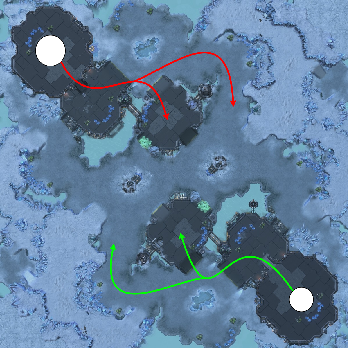 For the most part we see this design in the games that use this resource model. I want to cover one more aspect of this resource design and how map makers use resources and the map to encourage the players to engage. Let’s look at the map again, if we see where the 3rd bases for the players are, we can already see the intended impact of this map design, as the game goes on the players are forced to build bases closer and closer together. Let’s look at another map that is a bit more obvious with this intent, follow the arrows to see the expansion path of each player:
