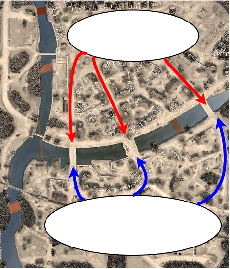The two players starting zones are in white and their movements paths are marked in red and blue. As you can see the players are encouraged to met in the middle (the green oval). This is the nature of symmetrical maps, they are balanced so one side doesn’t have the advantage but tend to create these chokes, for better or worse. For games like Red Alert and Blizzard’s RTS series, this aspect of map design is critical for game balance, resource location as well as visual appeal. Though to few attack paths (imagine the map above with only two attack paths) you can get a stalemate feel to the game, something few designers want.