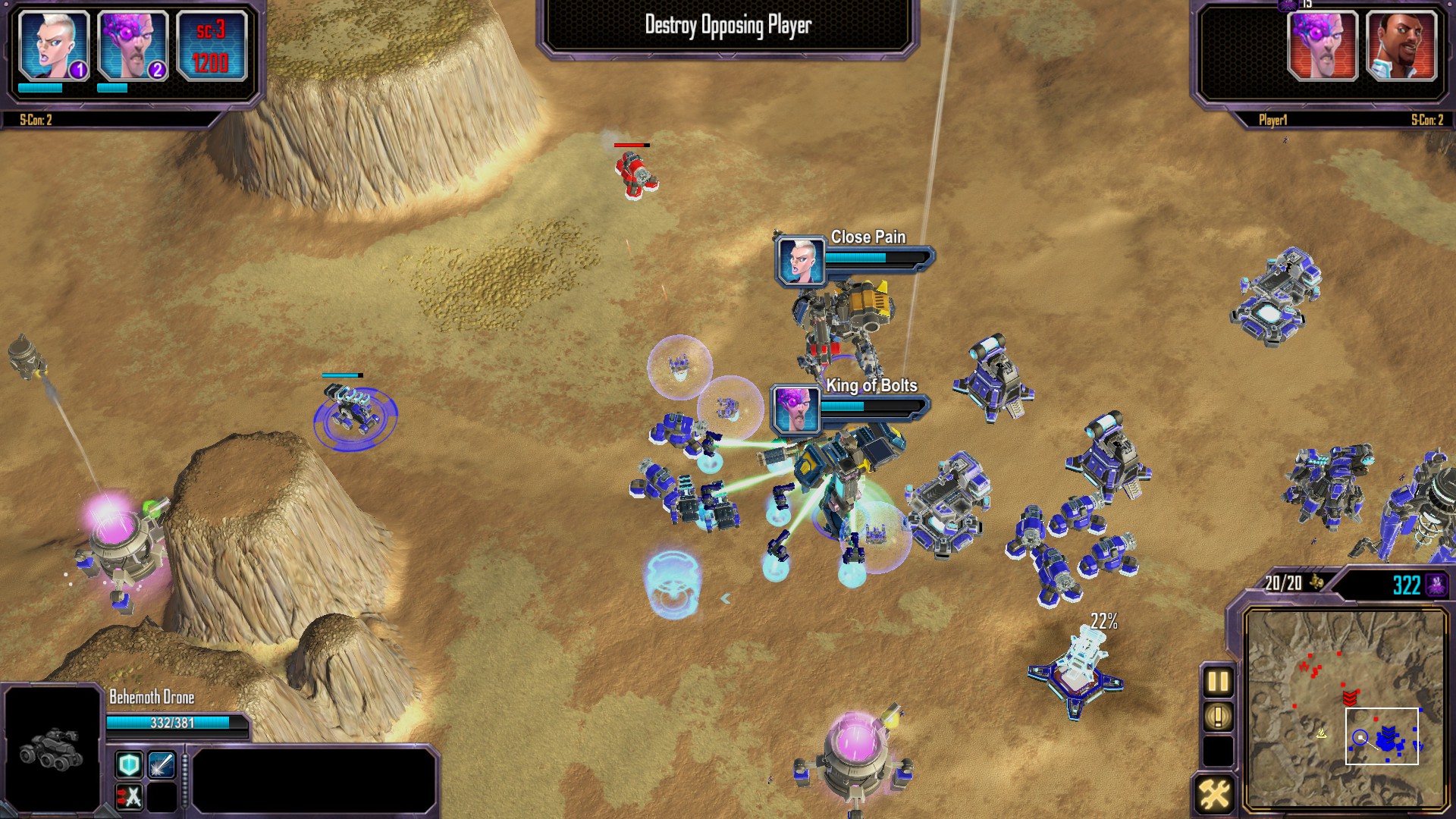 Matches tend to feel very dynamic, with lots of back-and-forth between players. Servos respawn on a timer like heroes in MOBA games (they cost no in-match resources) and have a huge impact on combat: it’s possible to hold off Servo-led forces with units and turrets, and to hold of large unit-based forces with Servos, meaning that matches tend to have a tug-of-war feel.