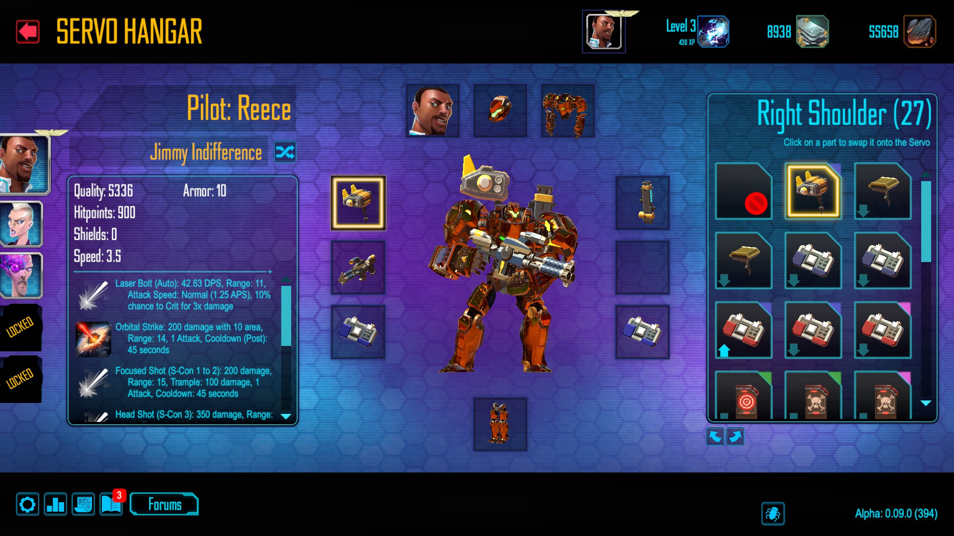 the Hangar is one of the single most important aspects of the game. It is here that players take 10 various components: Pilots, heads, chassis, legs, shoulder slots (2 of these) weapon slots (2 of these, though some weapons fill both), and ‘software’ slots (2 of these as well) and build a combat mech. Each component can have a variety of abilities, from modifying Servo hit points, armor, speed and resistance to the game’s various damage types, to special abilities that range from area damage to stuns, to game-affecting parts that decrease unit or structure build time, change unit attributes (e.g. a Servo part exists that increases vs structure damage for the melee Soldier Drone) or allow for more units to be called in.