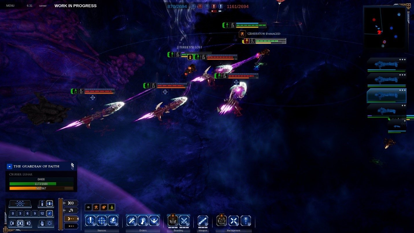 Many of the systems are managed and monitored by icons and healthbars, and it’s much harder to keep track of crew or morale in-the-moment than it is to look after the physical status of your ships. This makes crew and morale attacks kind of insidious – ditto the loss of weapons, which is mostly apparent via status icons. It’s something I feel like I’m starting to grok, but it’s taken me kind of a long time to become intuitively cognizant of each unit’s and ability’s threat profile and how to approach dealing with it. And I haven’t seen but a small % of all of the game’s factions, let alone a variety of ship combinations.