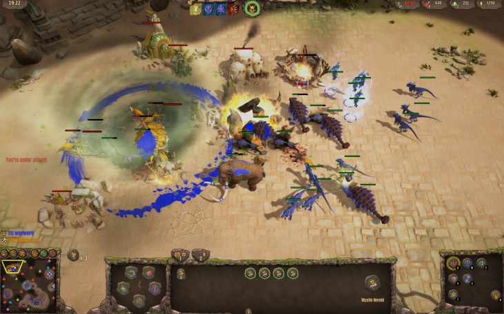 The core gameplay is inspired mostly by Age of Empires games – Age of Mythology is probably the closest direct comparison. Like in Age of Empires, you’re tasked with training a metric ton of workers, who must be split between the game’s 2 resources: a StarCraft-style crystal, and food. Kind of like Age of Empires, though with a slight flavor of WarCraft 3’s creep camps, there are dino ‘camps’ spread across the map, guarding map objectives and harvesting locations. Killing the dinos can be difficult in the early game, but nets you a nice little boost to your food resource.