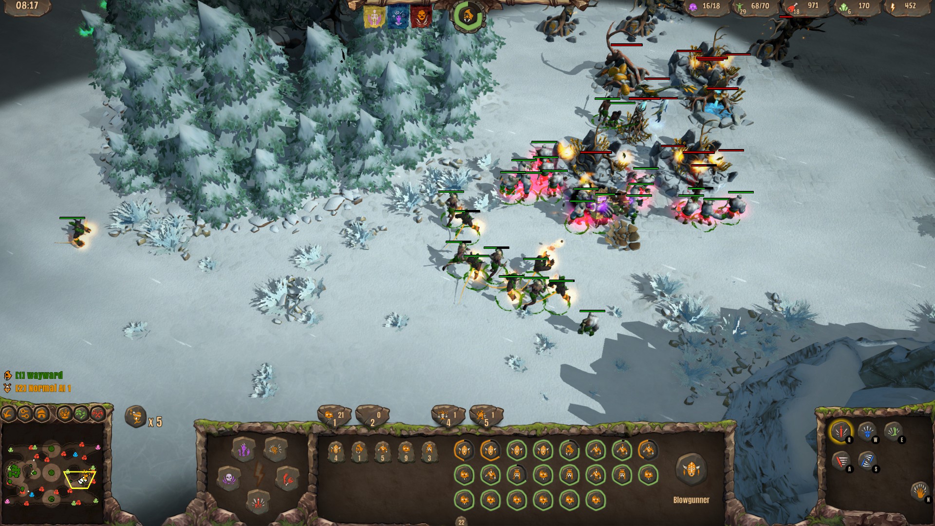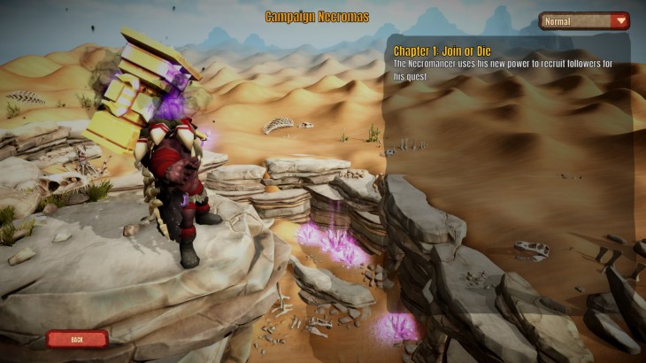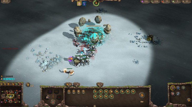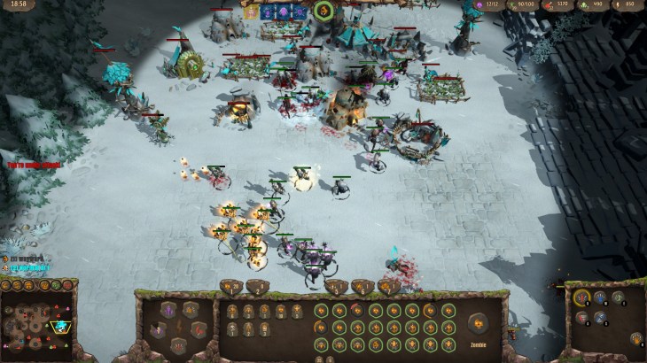 The game’s art is bright and colorful and really stylized. The characters are almost cartoony, with units like the Wildlander’s Axe Thrower kind of build like Kronk from The Emperor’s New Groove – he’s basically all torso. This is liable to turn off some players – I personally like it, but it’s not for everyone. And for all that, some units are surprisingly tough to tell apart, which is weird coming from a game where some of the units are frickin’ dinosaurs. This problem is most prevalent for the Necromas faction – zombies, workers, and basic infantry tend to have kind of similar silhouettes, as do their tier 2 units, the flame spirit and ice spirit.
