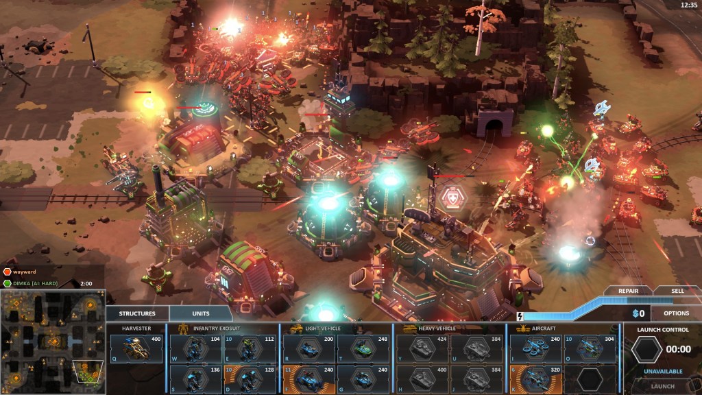 Units are almost Blizzard-style: most units have 1 or more active abilities, and the better abilities must be unlocked by researching them at the factory which produces the unit (I think they did this to make it easier to tie these upgrades to the unit via the game’s loadout system). There’s a touch of C&C to the units, though: the Global Risk’s Rocket trooper feels like something out of a C&C game, in particular. Damage bonuses based on unit type exist, and feel a little more like something you’d see from C&C – I don’t think I’d classify the counters as ‘hard’ as in Red Alert 3, per se, but the damage bonuses feel like they might be a little greater than you’d see in StarCraft. It’s actually a fairly good balance to me at this point.