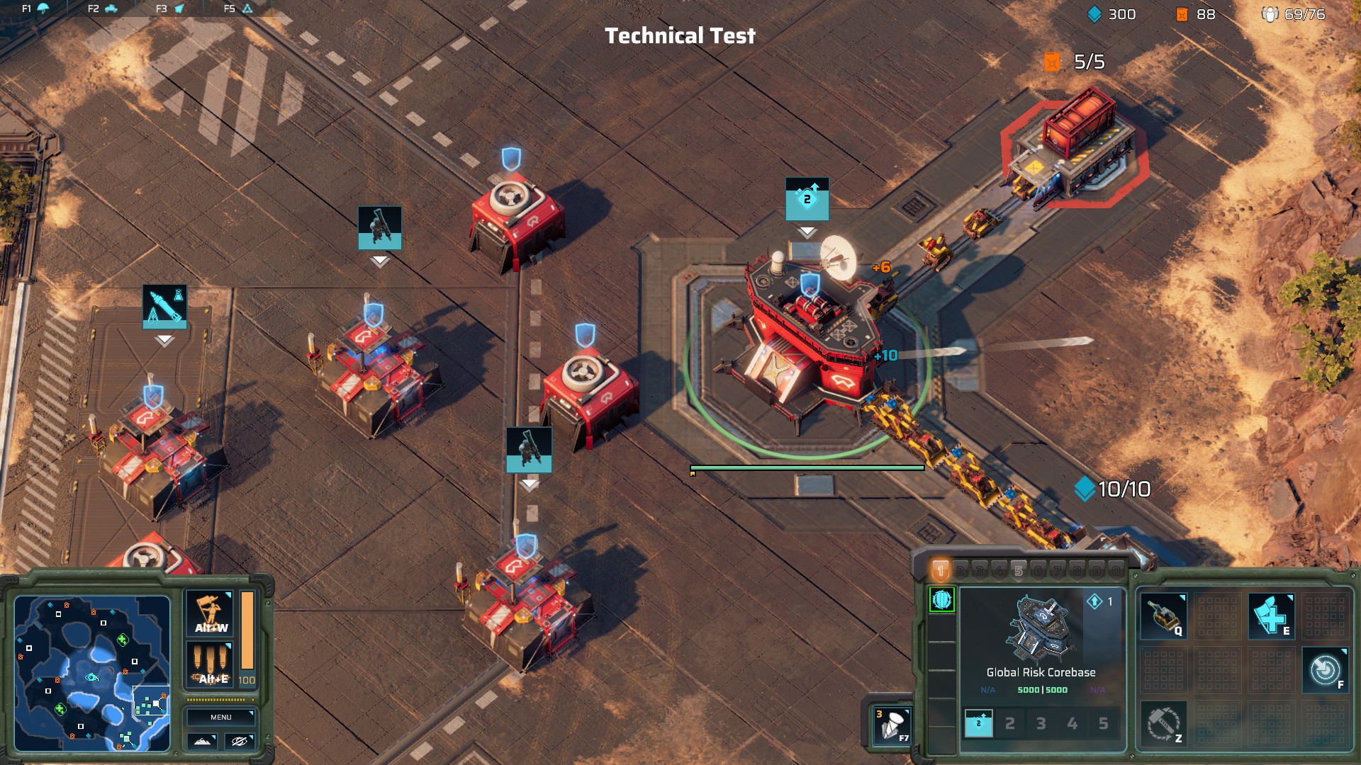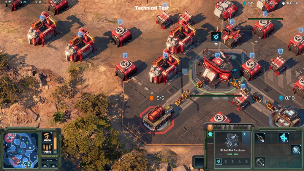 Because as of this early build, there are some striking similarities with StarCraft. The Global Risk’s basic infantry (called the Trooper) has exactly the Stimpack ability from StarCraft’s Marine – even the icon is virtually identical. Also, there’s a vehicle called the Cavalier that is a fast scout vehicle that has the same minelaying ability as the StarCraft Vulture, which certainly… invites comparisons. And the Logistics Depot that increases the Global Risk’s population cap looks strikingly like the Supply Depot from StarCraft’s Terran faction. There is also a capturable structure on maps that has the same effect as StarCraft 2’s Xel’Naga watchtower, and is controlled in the same way.