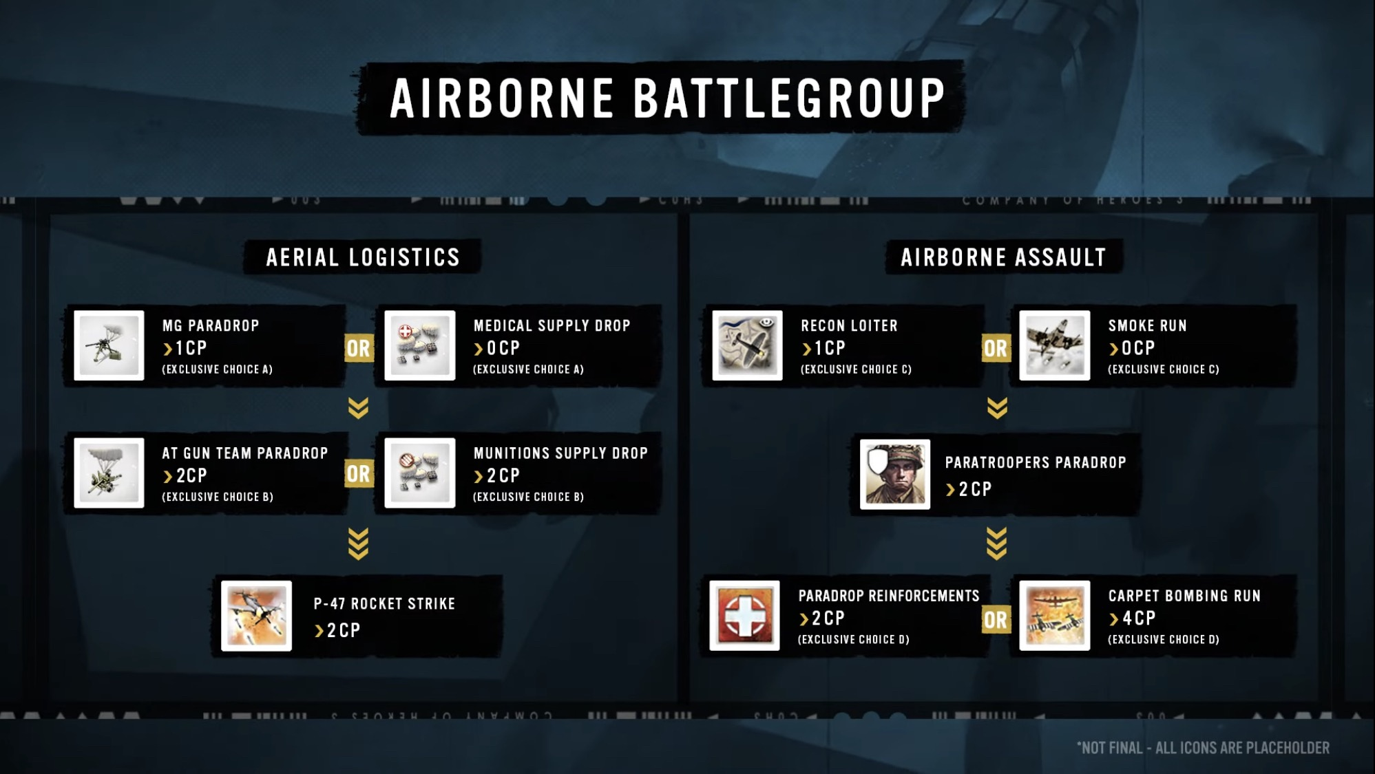 Company of Heroes 3 is actually a really interesting case since the Battlegroup system provides players with something that they BOTH choose outside of combat and unlock one point at a time, choice by choice, within battle. In this respect, I think it will prove to be more popular with players than COH2’s much more static system