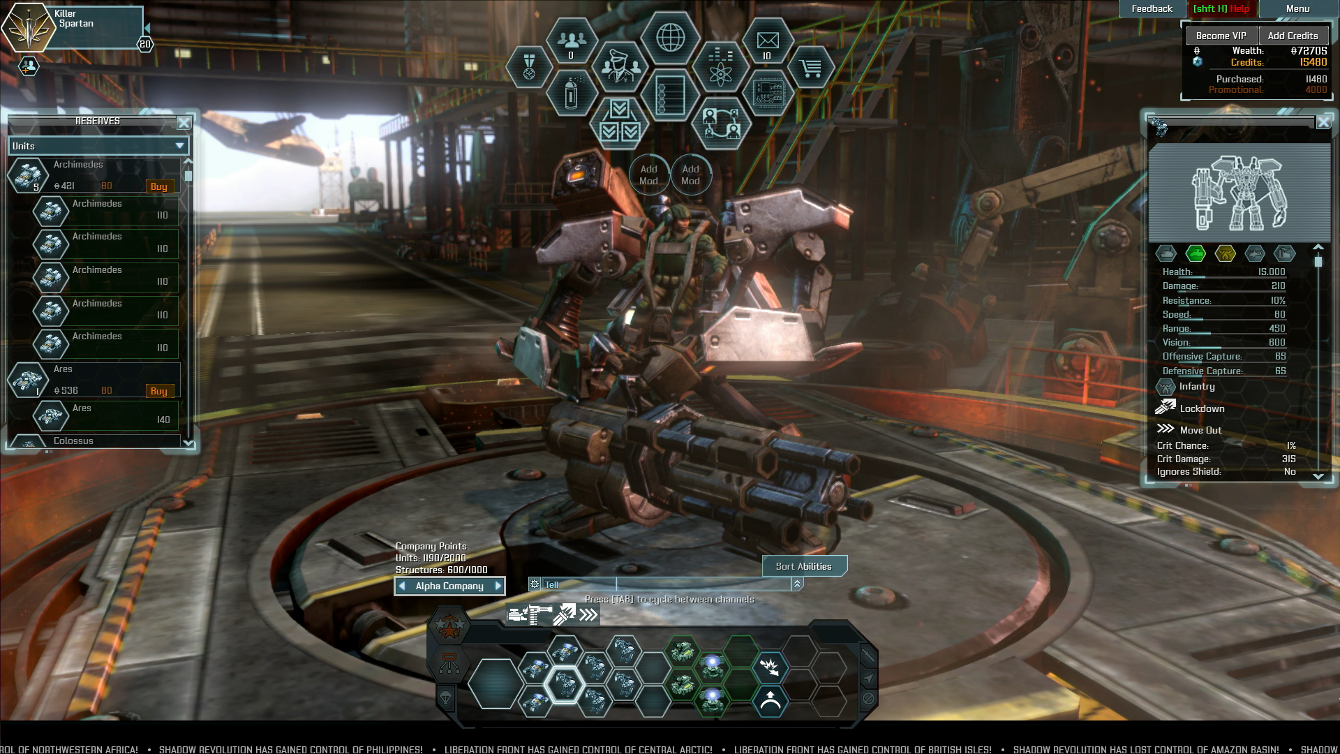 For the purposes of this article I’ll be defining a “loadout” as: a system in which the player gathers multiple reusable gameplay elements into a defined collection, separated from the rest of the gameplay. We can see loadouts in games like Crossfire Legion, where the player picks a Commander (basically, a collection of support powers they can use in the game), and as of this writing 7 unit types, which populate their various unit production structures, defining the units the player is allowed to build in the match.